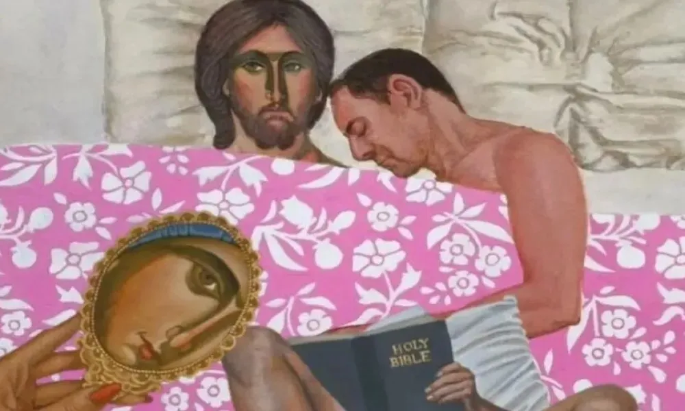 Güney Kıbrıs’ta Baf şehrinde bir galeride yer alan eserde Hz. İsa ve Meryem Ana figürlerinin kullanılması üzerine ortalık karıştı. Siyasi partiler ardı ardına kınama mesajları yayınladı