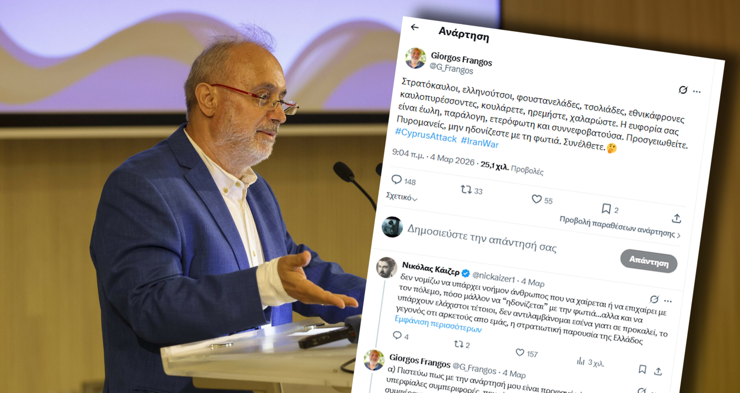 Rum Gazeteciler Birliği Başkanı @G_Frangos, Yunanistan’dan iki savaş gemisi ve dört savaş uçağının güney Kıbrıs’a gelmesini ‘’coşku ile karşılayanlara ve @Christodulides yönetimine’’ ağır sözlerle yüklendi ve ‘’Yangından zevk almayı bırakın kendinize gelin. Ordu kaşarları